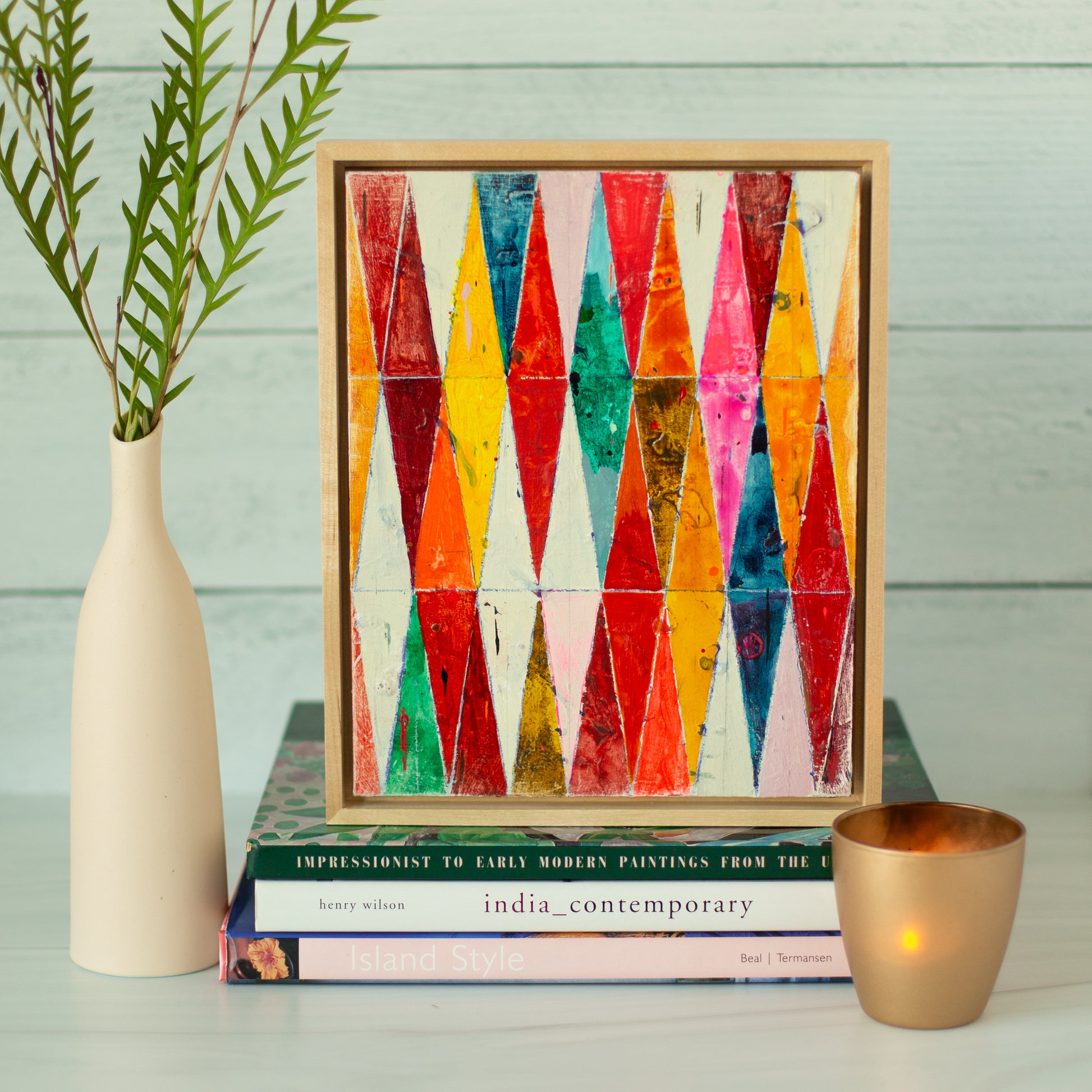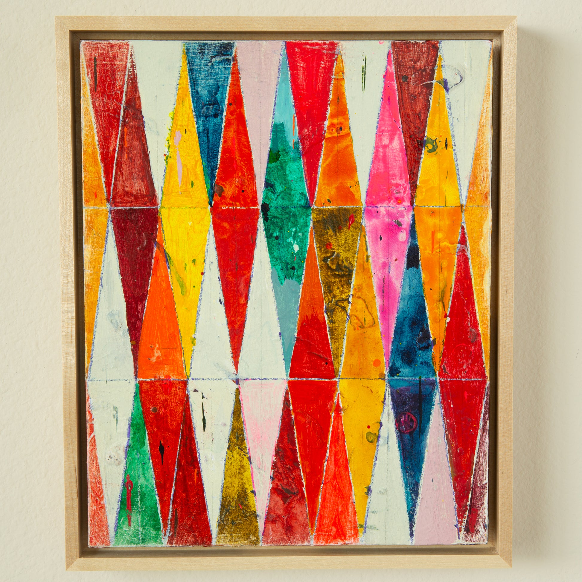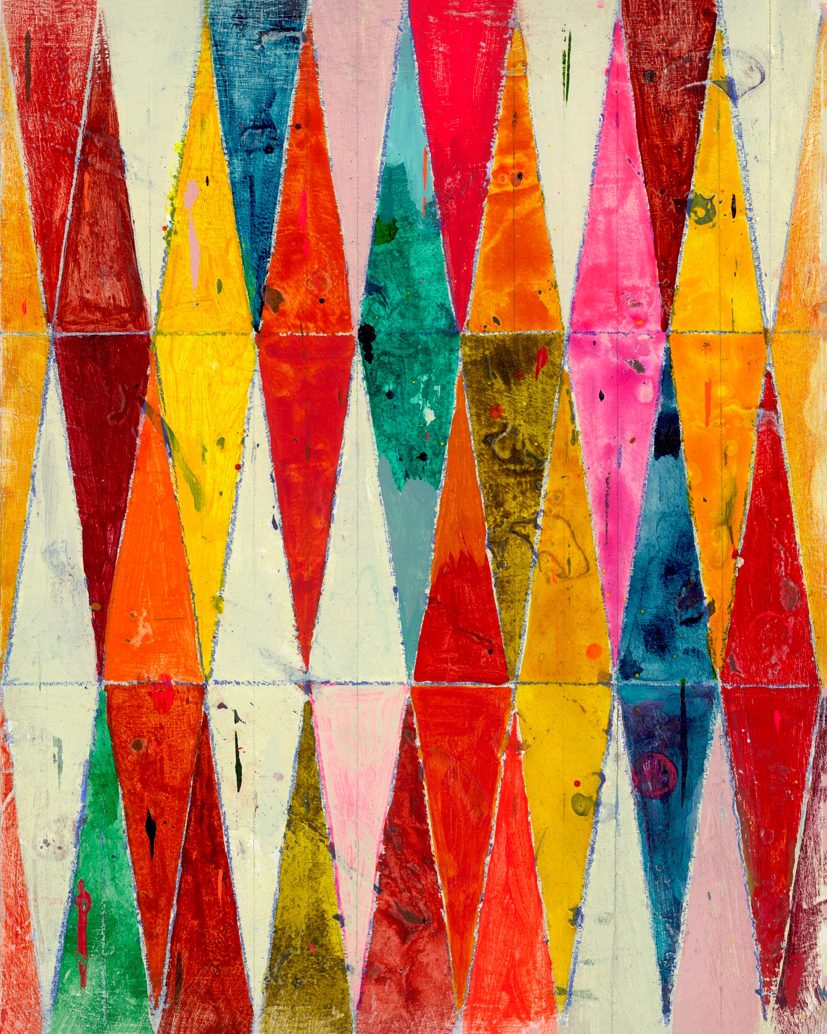 This painting was inspired by a beautiful North African wool rug. As such, I wanted this piece to have a textured, weathered, woven feeling to it. I used colored pencil to contrast with the paint. The pencil looks a bit like thread, and brought to mind the kind of thread work you’d see on a quilt or rug.