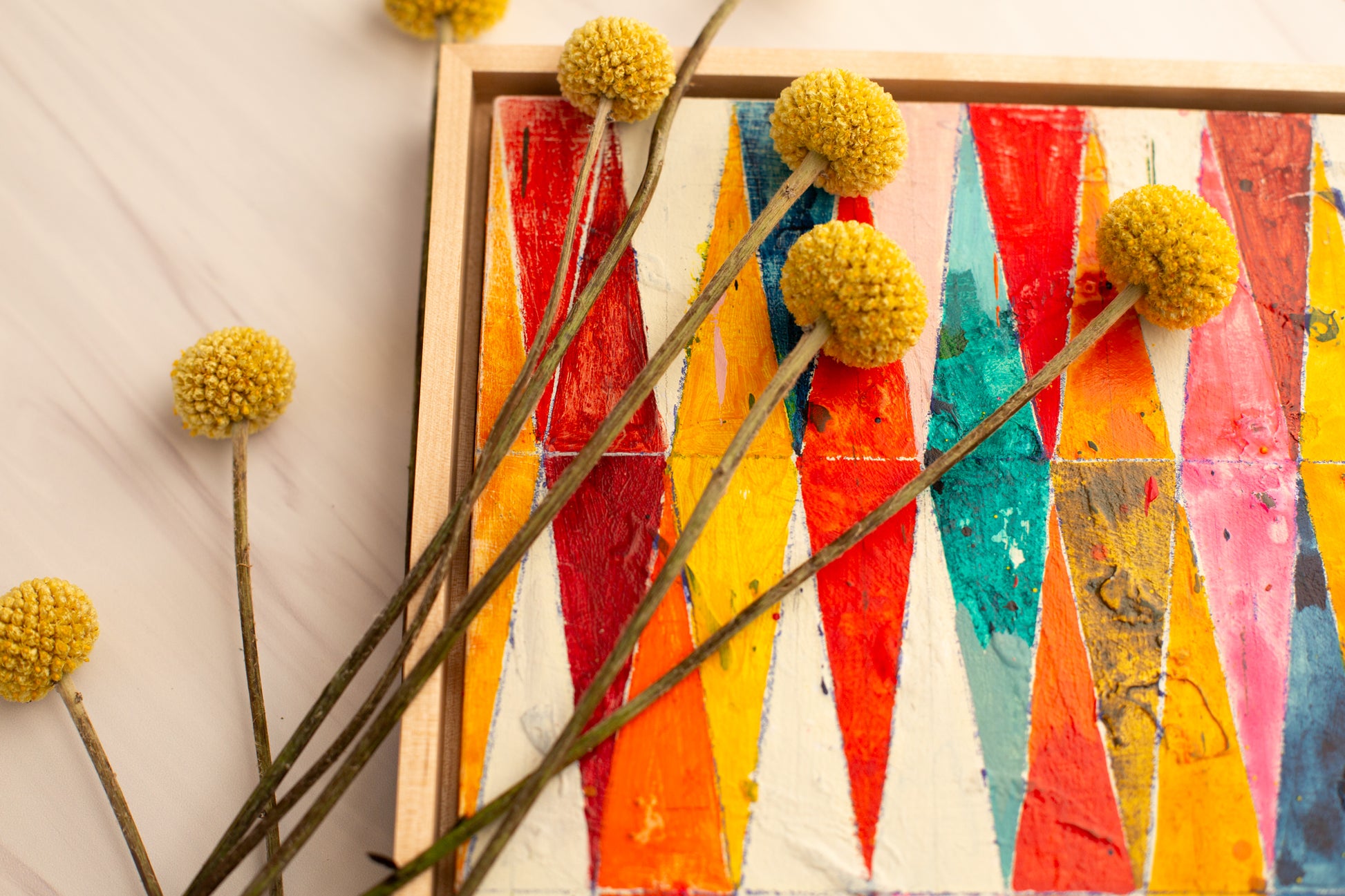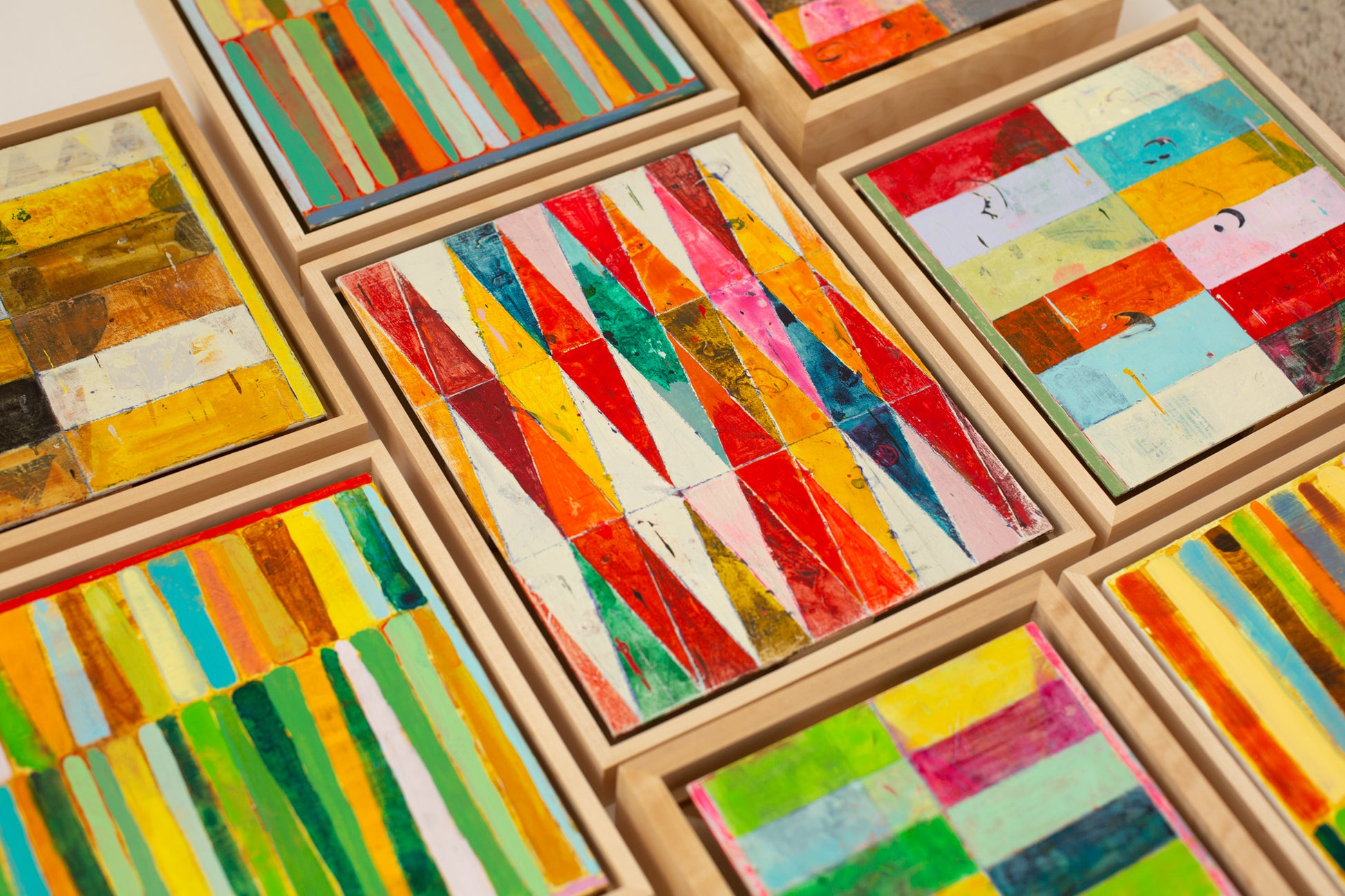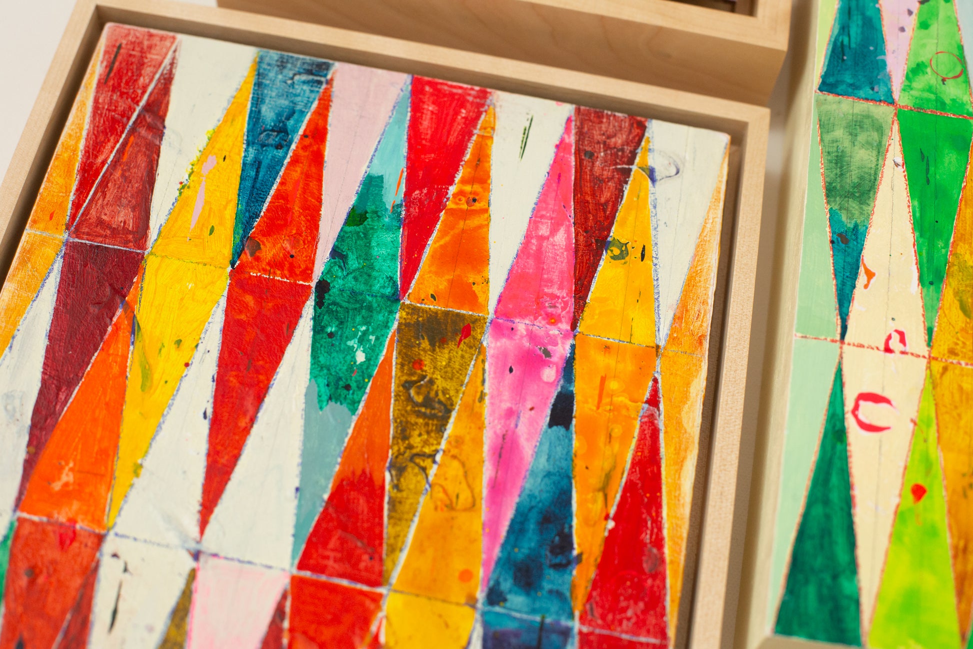 This painting was inspired by a beautiful North African wool rug. As such, I wanted this piece to have a textured, weathered, woven feeling to it. I used colored pencil to contrast with the paint. The pencil looks a bit like thread, and brought to mind the kind of thread work you’d see on a quilt or rug.