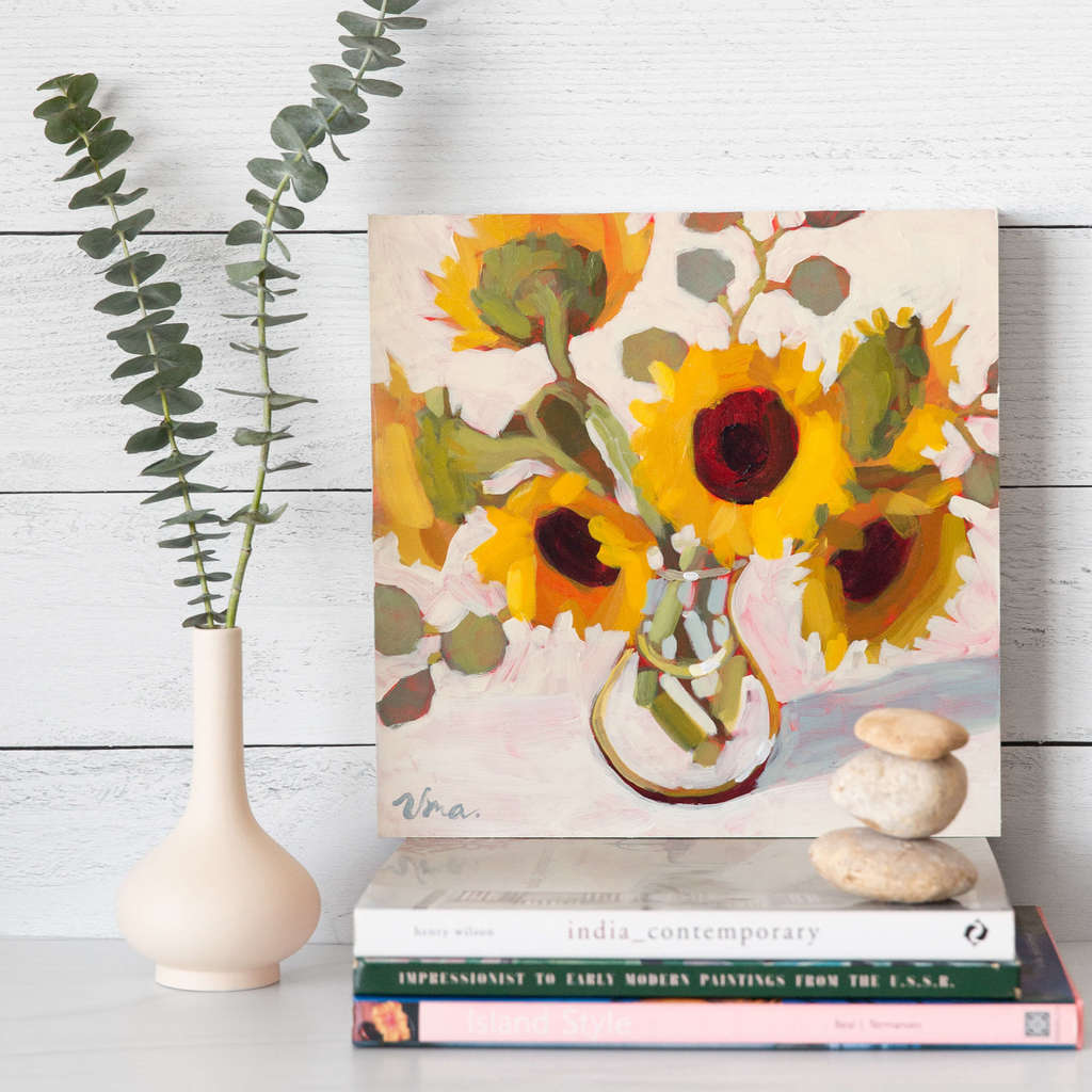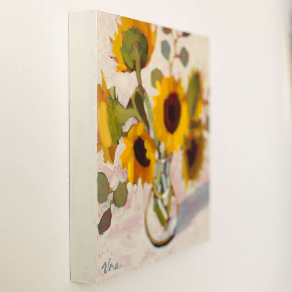 Half a dozen sunflowers, lighting up the room.