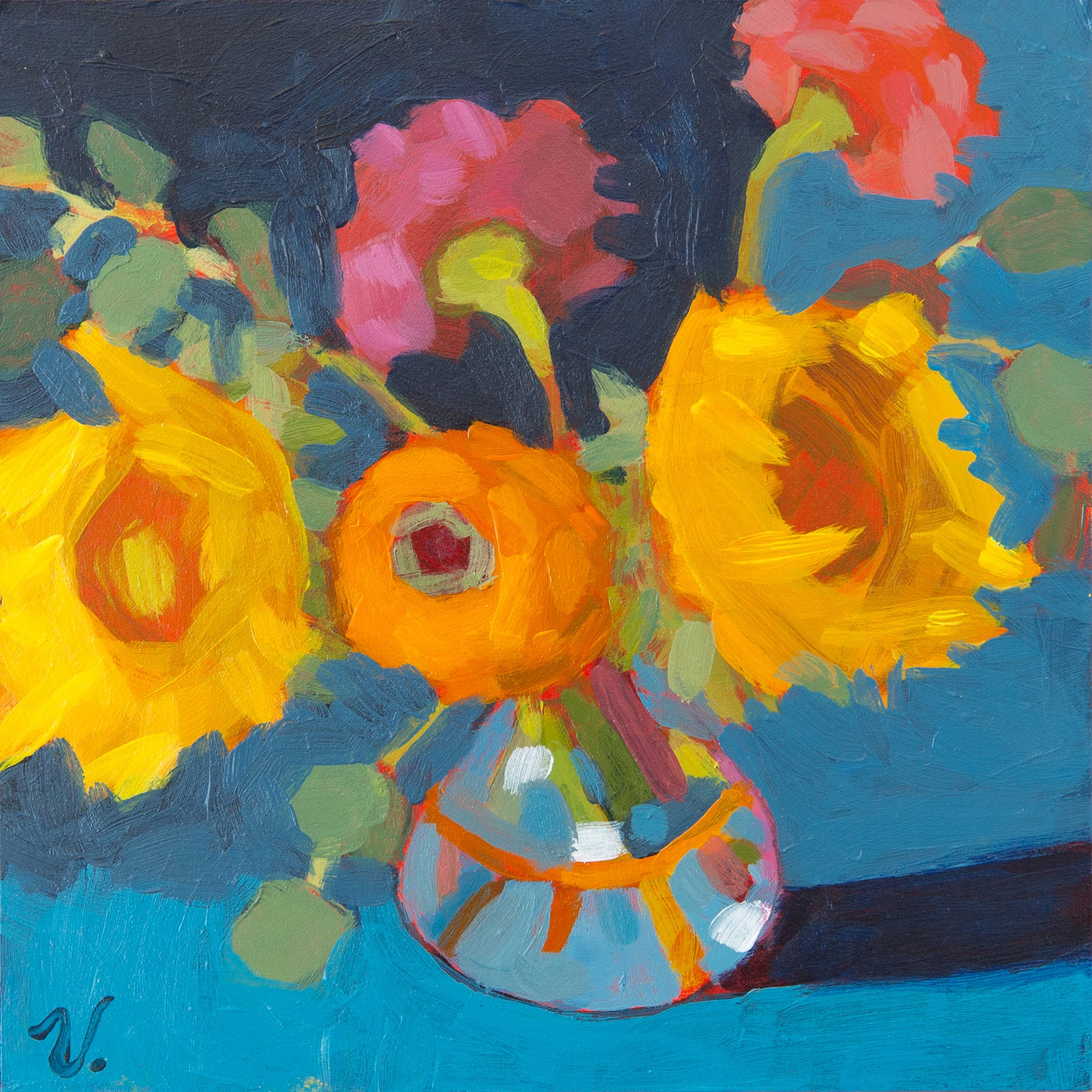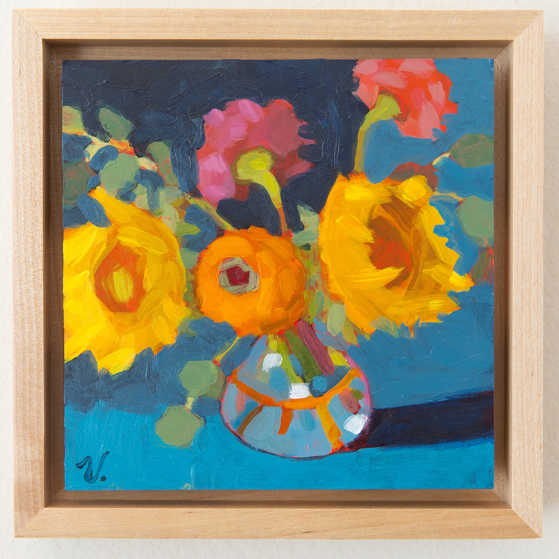 I loved this quintet of two sunflowers and three zinnias so much, I painted it twice. The title is taken from the Navajo traditional prayer is called “The Beauty Way.” Here it is translated into English: