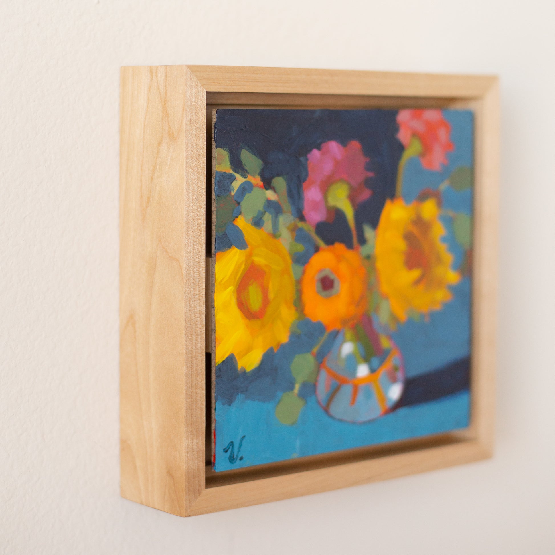 Framed in an elegant maple wood floater frame, 1 ⅞” deep. Premium hardwood.