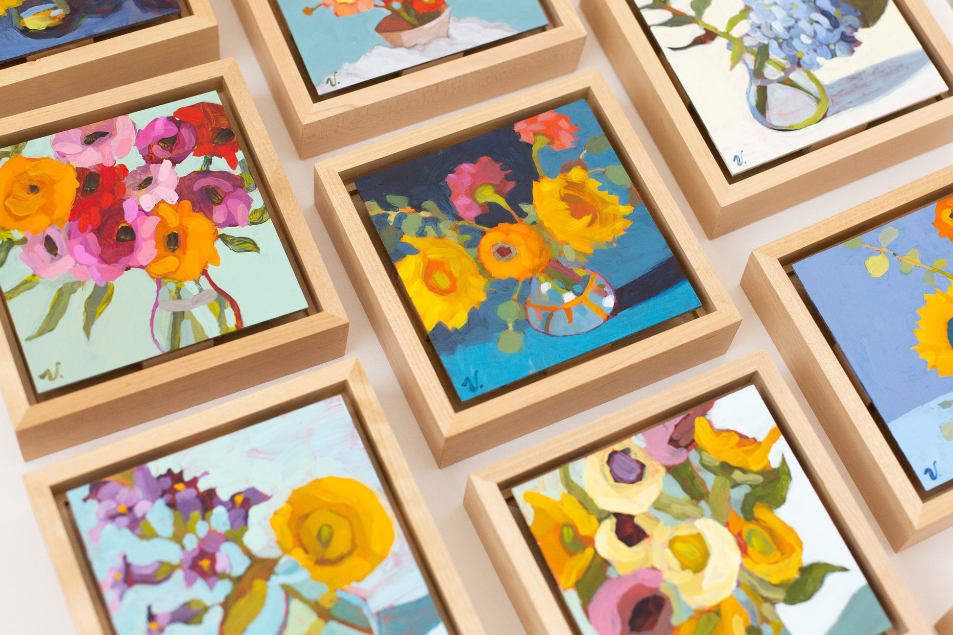 Frame dimensions: 7 ⅜ x 7 ⅜. Artwork dimensions: 6” x 6”.