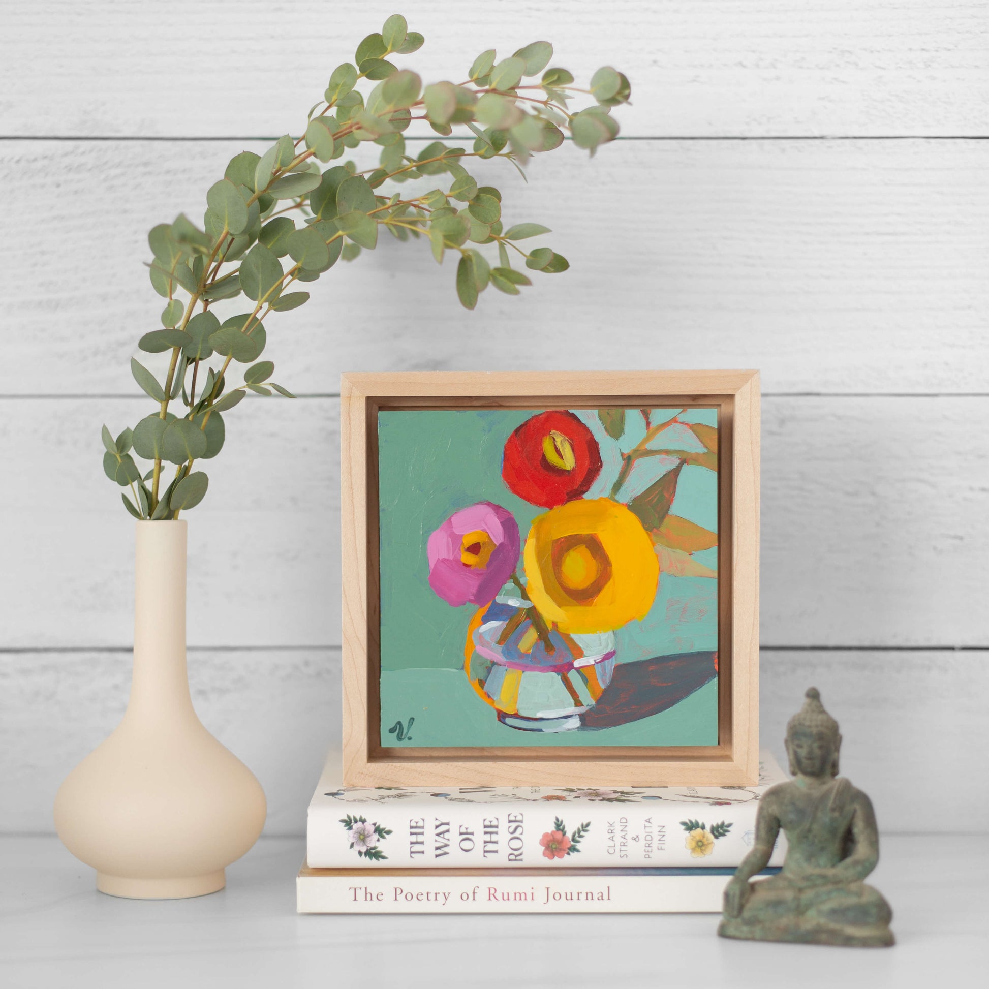Framed in an elegant maple wood floater frame, 1 ⅞” deep. Premium hardwood.