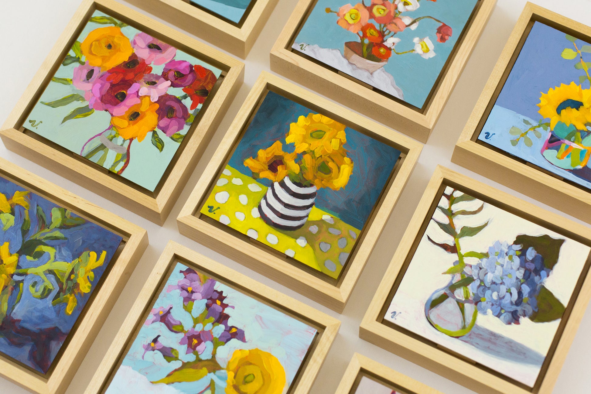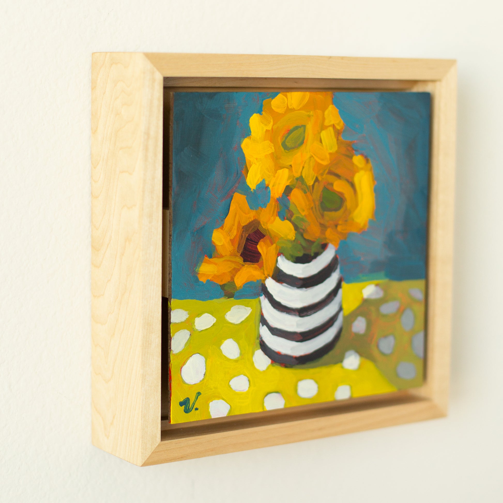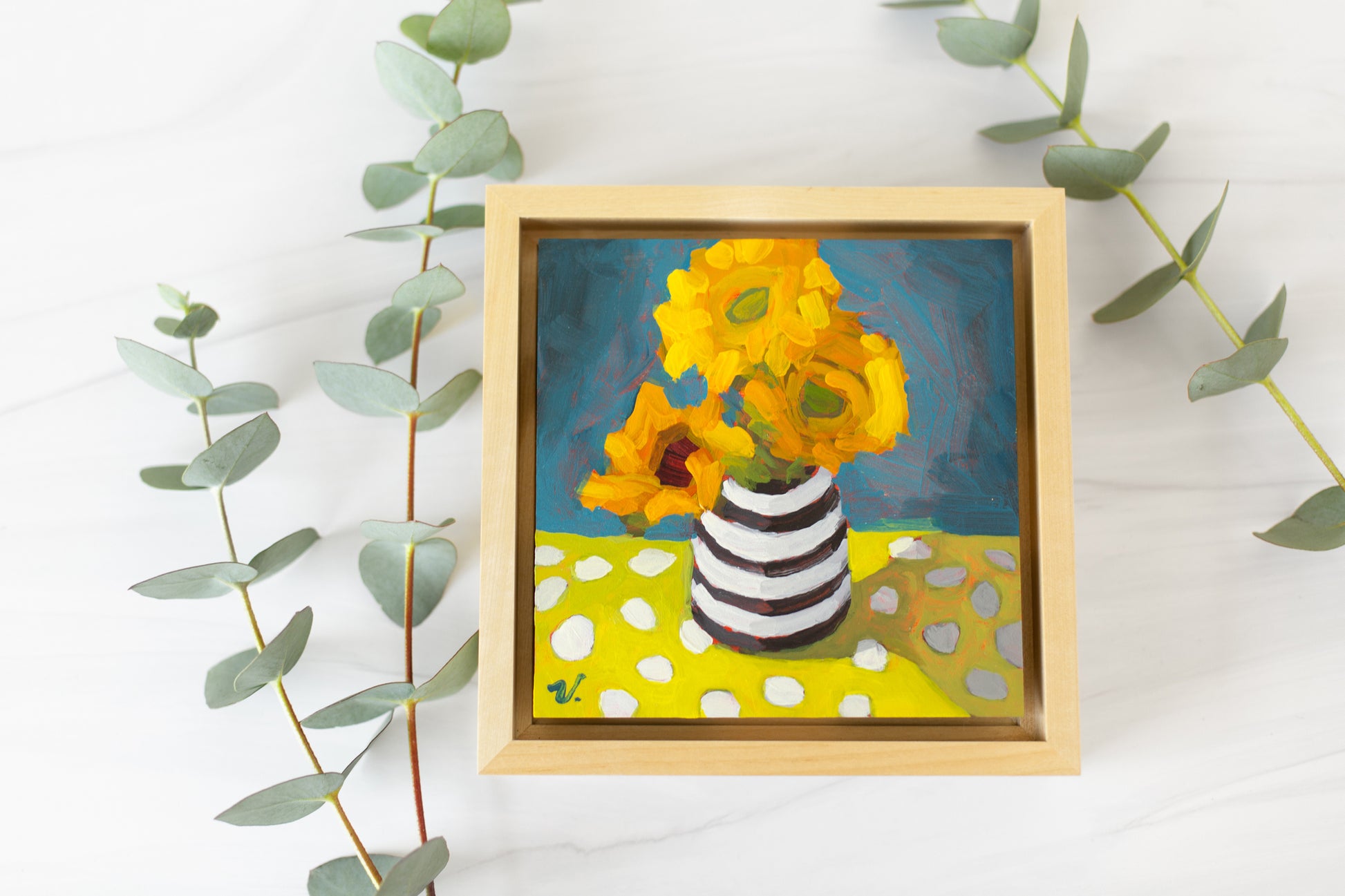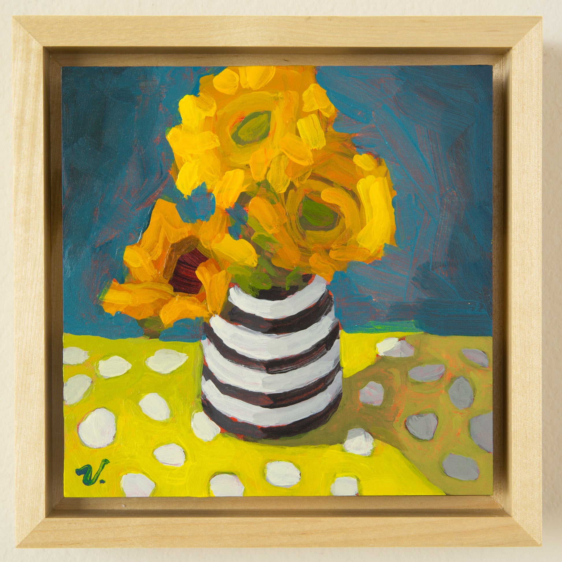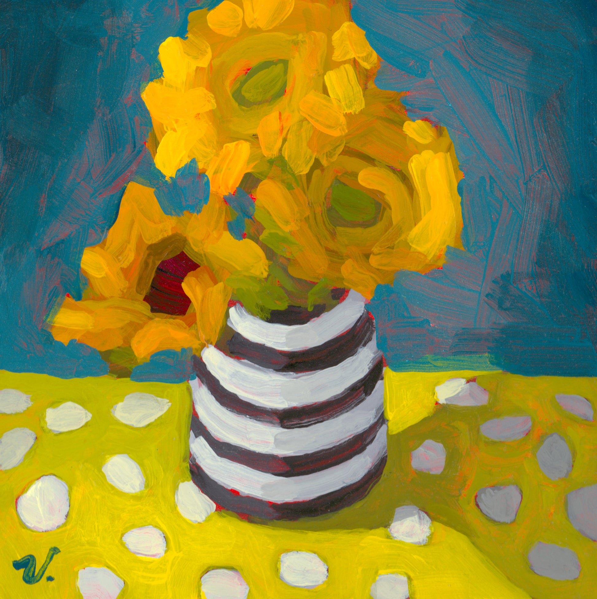 Sometimes, my inspiration for a painting is a single color that draws me in. In this case, it was the contrast of cool and warm yellows that drew me to this floral setup. At the time I painted this, I had just added a new color to my palette — cadmium yellow light (you’ll see it mainly in the yellow table cloth) and I couldn’t wait to play with it. In terms of color temperatures, this is considered a “cool” yellow. It’s quite different than the warm yellows of the sunflowers. By the way, painting the dots and stripes was a lot of fun!