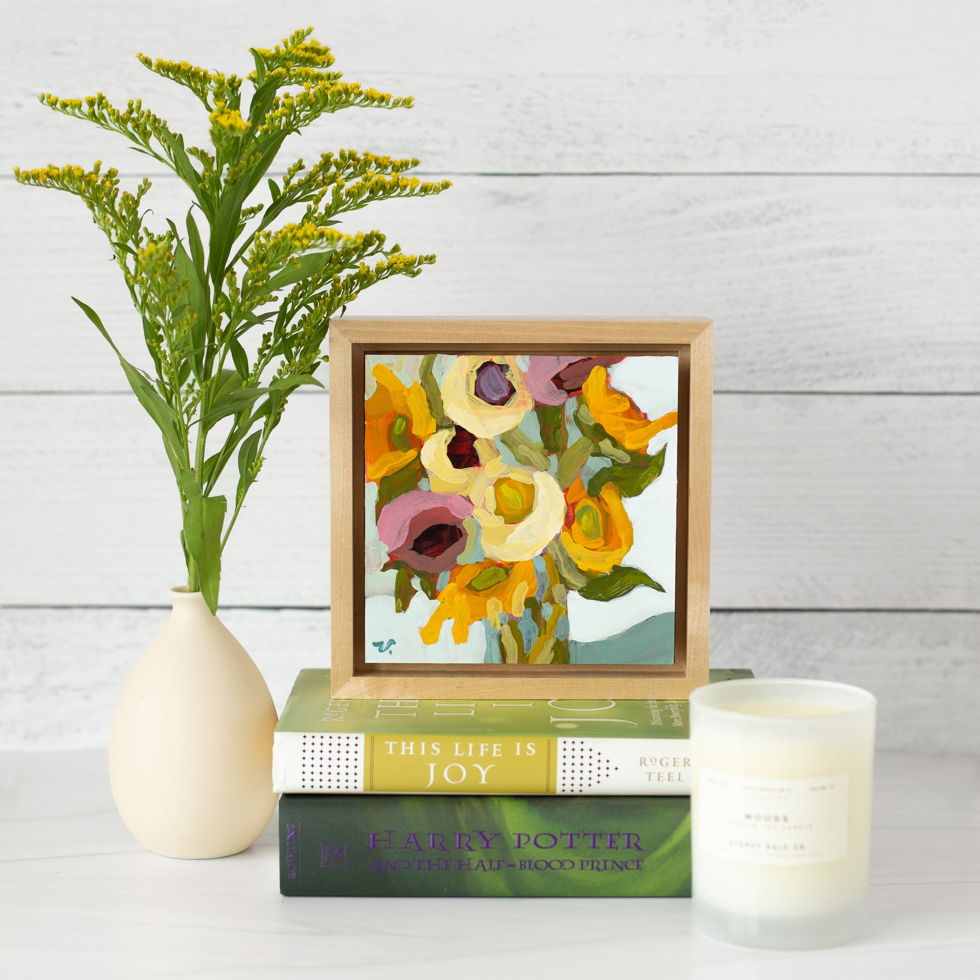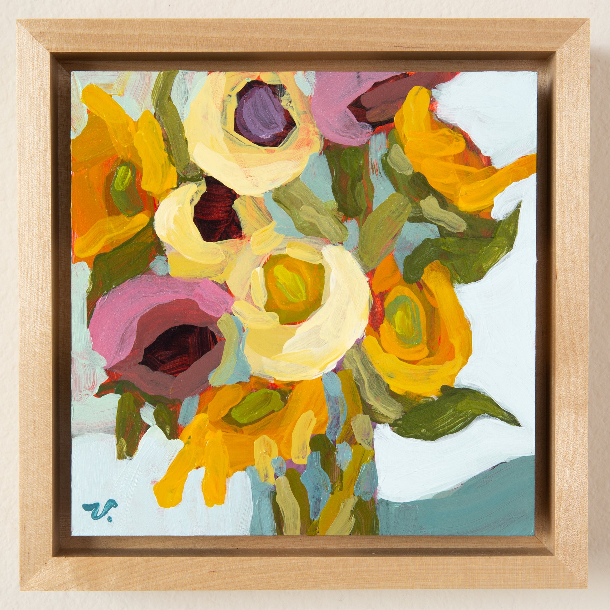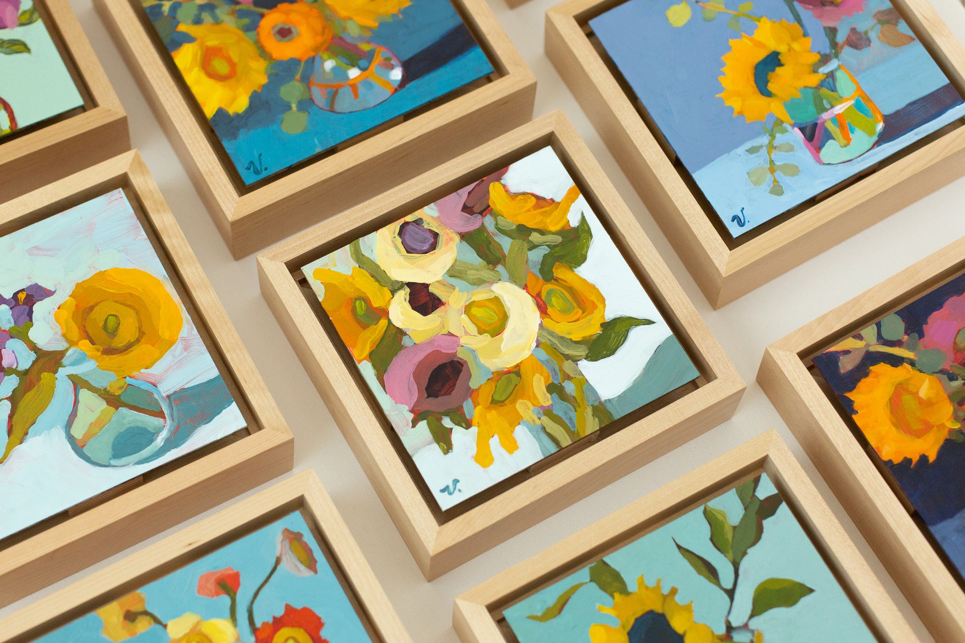 Once a year, Grassdale Farm (near Austin, Texas) produces these stunning bouquets of sunflowers that come in every color of the sunflower rainbow! Yellow sunnies with green centers, yellow sunnies with dark centers, plum sunnies, white blond sunnies, two-tone sunnies that are both yellow AND plum colored. These once-a-year flowers are pure magic. I photograph them so I can paint from this bouquet all year long.