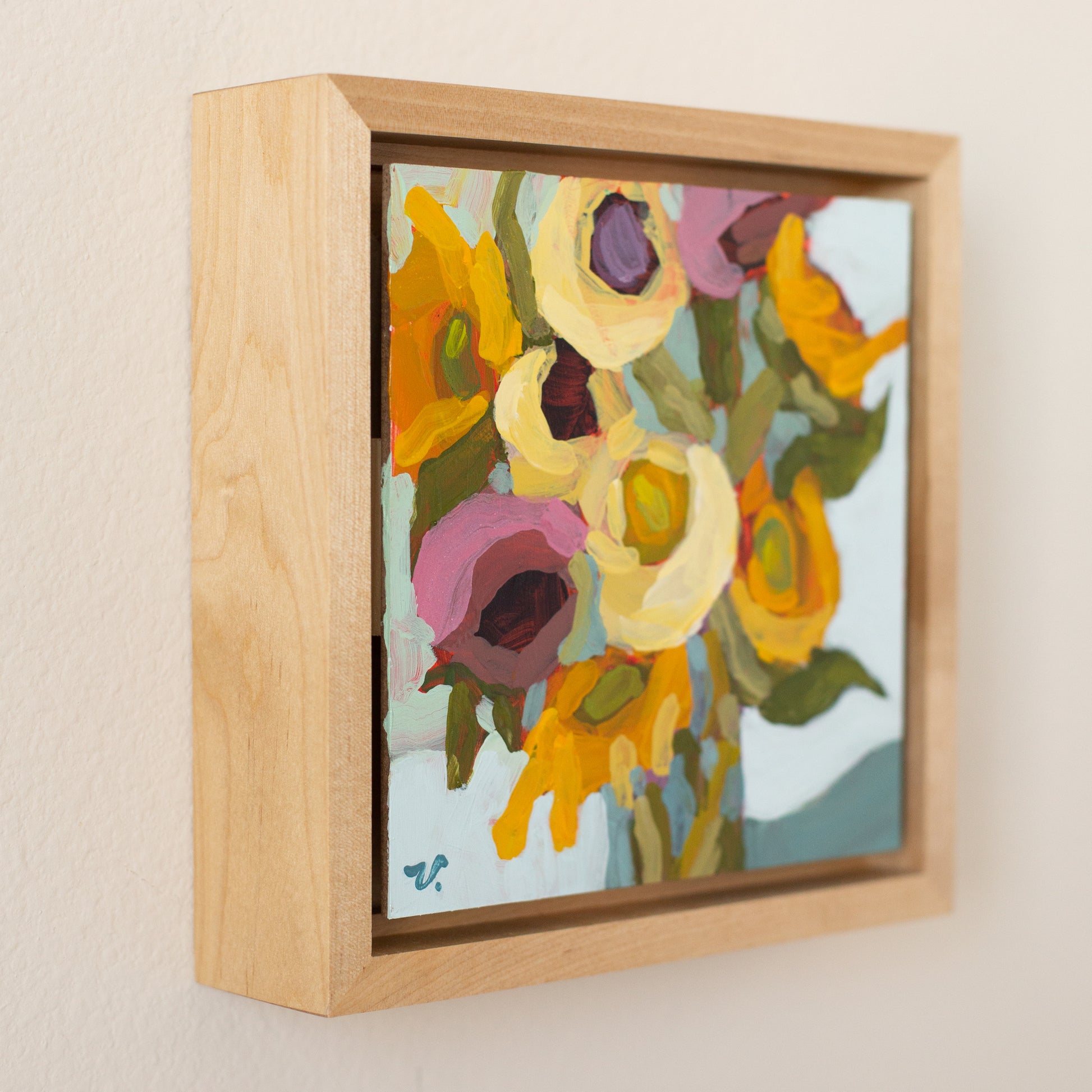 Framed in an elegant maple wood floater frame, 1 ⅞” deep. Premium hardwood.